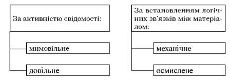 Рис. 2.3.6. Типи запам'ятовування Мимовільне запам'ятовування здійснюється без спеціальної мети запам'ятати. Довільне - передбачає докладання людиною вольових зусиль, має цілеспрямований характер. При механічному запам'ятовуванні логічні зв'язки між матеріалом не встановлюються, інформація неначе "зазубрюється", при осмисленому - логічні зв'язки встановлюються, запам'ятовування спирається на розуміння змісту інформації. Під час запам'ятовування значного обсягу інформації перевага надається осмисленому запам'ятовуванню, за наявності потреби точно зафіксувати терміни, цифри використовується механічне запам'ятовування. Існують фактори, що визначають успішність запам'ятовування: - емоційний та фізичний стан (поганий настрій та хвороба погіршують продуктивність цього процесу), - вік (є періоди піку та спаду продуктивності запам'ятовування (юність та старість відповідно), - установка (завдання, яке ставить людина), - характеристики самого матеріалу (його значимість, логічність, обсяг тощо). Збереження - це утримання в корі головного мозку інформації, яку людина попередньо запам'ятала Психологи стверджують, що інформація зберігається у психіці людини на двох рівнях - усвідомлюваному (тому доступна для відтворення та використання) та неусвідомлюваному (глибини психіки ускладнюють, а іноді й унеможливлюють актуалізацію цієї інформації для людини). Можна також перерахувати фактори, що визначають якість збереження інформації: - використання в діяльності (внаслідок повторення матеріал краще і довше зберігається), - установка (завдання щодо тривалості та якості збереження інформації), - характеристики самого матеріалу (значимість, осмисленість подовжують тривалість збереження знань). Відтворення - процес активізації в мозку інформації, яка була попередньо запам'ятовано та збережена Відтворення матеріалу, який зберігається в довготривалій пам'яті, полягає в переході його з довготривалої пам'яті в короткочасну, тобто актуалізація його у свідомості. Відтворення залежить від процесів запам'ятовування і забування, але також має свої механізми. Відтворення може мати три форми - впізнавання, пригадування і спогади. Простою формою відтворення є впізнавання. Впізнавання - це відтворення, що виникає під час повторного сприймання предметів. Впізнавання буває повним і неповним. Складнішою формою відтворення є згадування. Особливість згадування полягає в тому, що воно відбувається без повторного сприйняття того, що відтворюється. Згадування може бути довільним, коли воно зумовлене актуальною потребою відтворити потрібну інформацію, або мимовільним, коли образи або відомості спливають у свідомості без будь-яких усвідомлюваних мотивів. В роботі пам'яті людини фігурують спогади - відтворення образів минулого, локалізованих у просторі й часі (певних епізодів життя, приміром років навчання в школі тощо). Має місце дія певних факторів, що впливають на успішність відтворення: - вік людини, - тривалість збереження матеріалу, - установка на відтворення, - обсяг та осмисленість самого матеріалу тощо. Забування - це процес втрати або погіршення точності чи обсягу матеріалу, що був запам'ятований Відповідно, якщо втрачена частина інформації, то забування вважають частковим, якщо весь матеріал - то повним. Попри негативне сприймання цього процесу б