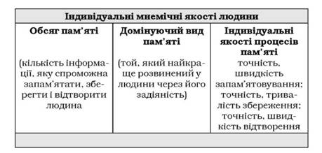Рис. 2.3.7. Індивідуальні мнемічні якості людини В професійній діяльності важливо враховувати власні індивідуальні відмінності пам'яті для того, щоб максимально продуктивно використовувати свої потенційні можливості. Слід також зазначити, що якості пам'яті не є повністю вродженими, тому добре піддаються коригуванню та вдосконаленню.
