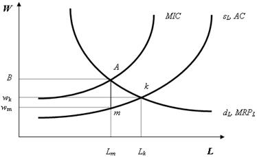 Кривая предложения труда для монопсонической фирмы совпадает с кривой совокупного предложения для рынка труда. В то же время она представляет собой одновременно кривую средних издержек (АС) для фирмы, поскольку показывает ставку з\п одного работника, которую следует платить. При этом для привлечения дополнительных работников следует увеличить ставку. В связи с этим дополнительные издержки на труд (MIC) больше средних – графически это отражается в том, что кривая MIC лежит левее и выше АС. Следует иметь в виду, что, нанимая дополнительного работника и увеличивая ставку з\п, монопсонист теряет на увеличении заработной платы, но выигрывает на получении дополнительной выручки MRPL. Чтобы макс. прибыль, фирма будет уравнивать предельные затраты на труд MIC и MRPL – точка А. Количество нанятых работников составит Lm, а ставка заработной платы wm – соответствующая точка m на кривой sL. Таким образом, если в случае совершенной конкуренции равновесие устанавливается в точке k – точке пересечения кривых спроса и предложения (ставку заработной платы wk получило бы Lk рабочих), то монопсонист нанимает меньше работников (Lm) и платит им меньшую ставку заработной платы - wm. При этом работники получают ставку заработной платы меньше, чем созданный ими предельный продукт в денежном выражении (MRPL) на величину Am. А фирма добавляет к своим доходам сумму, равную площади BAmwm. Монополия на рынке труда возникает тогда, когда на стороне предложения труда выступает профсоюз. В этом случае, как на всяком монополизированном рынке, цена будет зависеть не только от вида функций спроса и предложения, но и от затрат и спроса профсоюза. С точки зрения профсоюза кривая рыночного спроса на труд является кривой его среднего дохода, так как каждая ее точка показывает, по какой ставке заработной платы фирмы согласны нанять соответствующее количество труда. Кривая рыночного предложения труда соответствует кривой предельных затрат профсоюза, так как каждая ее точка показывает, какую цену требуют рабочие за дополнительную единицу труда. Если профсоюз стремится максимизировать свою «прибыль», т.е. разность между суммой денег, которую согласны заплатить за труд фирмы, и суммой цен предложения каждой единицы труда, то к кривой среднего дохода (кривой рыночного спроса) нужно построить кривую предельного дохода профсоюза, которая проходит круче кривой среднего дохода. Точка ее пересечения с кривых предельного дохода и предложения труда (кривой предельных затрат профсоюза) является точкой Курно, по которой он определит сочетание занятости и цены труда.