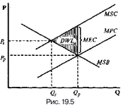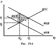 Поскольку получающие внешние издержки третьи лица не участвуют в заключении и совершении сделок с данным товаром, их издержки не учитываются при заключении таких сделок, а устанавливающиеся на рынке равновесные цена и количество отличаются от тех величин, которые были бы получены при таком учете. Поэтому результатом является недооценка (занижение цены) и перепроизводство (избыточный выпуск) данного товара: Qр >Qs, a Pp <Ps. Это ведет к использованию излишних ресурсов в производстве данного блага и, следовательно, неэффективному размещению благ в экономике. Важно подчеркнуть, что негативные экстерналии возникают независимо от воли и желания порождающих их своими действиями субъектов. Положительные внешние эффекты являются позитивными воздействиями участвующих в сделке экономических агентов на третьих лиц. Фактически они означают невыявленное в данной сделке производство определенного блага без соответствующей его оплаты. Это приводит к возникновению внешней для данной сделки выгоды при производстве и потреблении данного товара (ТЕВ и МЕВ) (на рис. 19.6 предполагаются наличие внешней выгоды и отсутствие внешних издержек).