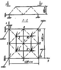 4.18. При построении алгоритма расчета структурных конструкций произвольной формы первостепенное значение имеют способы задания и переработки исходной информации. Сведения о связи между элементами в стержневой системе и количестве неизвестных задаются нумерацией узлов и описанием условий опирания. От принятого порядка нумерации узлов зависит характер структуры матрицы жесткости. Для метода перемещений всегда можно получить ленточную структуру, правильно выбирая порядок нумерации узлов. Размер ширины ленты определяется стержнем с максимальной разницей между номерами соединяемых узлов, поэтому для обеспечения наименьшей ширины ленты системы канонических уравнений рекомендуется нумерация, при которой разница между номерами узлов, соединенных стержнями, будет наименьшей. Па рис. 4.4 показан пример нумерации узлов для простейшей стержневой системы. Форма записи условии опирания может быть выбрана индивидуально в зависимости от особенностей построения алгоритма. Алгоритм формирования матрицы жесткости должен быть построен с учетом вычеркивания строк и столбцов, соответствующих заданным закреплениям. Однако, несмотря на то, что указанная операция, позволяющая уменьшить общее число уравнений равновесия, является относительно простой и может быть легко запрограммирована, часто оказывается удобным непосредственно решить первоначальную систему уравнений с тем, чтобы избежать реорганизации машинной памяти. Это рекомендуется осуществлять с помощью искусственного приема, при использовании которого вместо исключения уравнения равновесия диагональному элементу в нем присваивается значение 1, а остальным элементам, включая элементы правых частей, а также элементам соответствующего столбца присваивается значение 0. Вычеркиваются лишь те блочные строки и столбцы, которые соответствуют узлам, закрепленным по всем трем направлениям координатных осей. В этом случае размеры всех подматриц сохраняются, что значительно упрощает построение алгоритма.