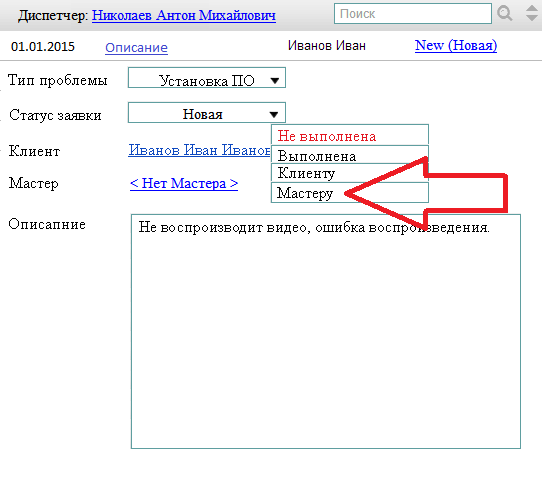 Рисунок 11 — Форма «Заявка под правами диспетчера» На Рис. 11 изображена новая заявка, в которой диспетчер меняет статус заявки на «Мастеру» и назначает ответственного мастера в поле Мастер. После чего клиент просматривая свою заявку увидит обновленный статус заявки и мастера, который будет выполнять работу.