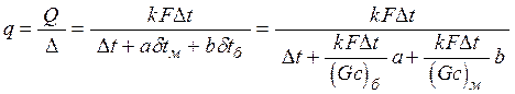 где D t =D- a d tм - bdtб. (2.8) Если вычислять D t по (2.5), то b =0.65 для всех схем, 0.35 < a < 0.65 в зависимости от схемы. Если вычислять D t по (2.6), то a=b =0.5. Тепловая нагрузка, отнесенная к максимальной разности температур, называется удельной теплопроизводительностью. , или