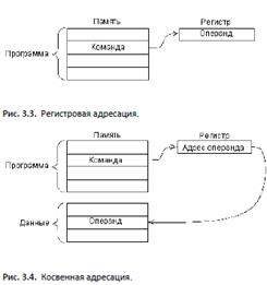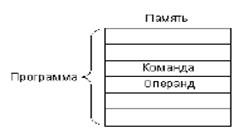 30. Команда микропроцессора включает в себя: код команды, операнды, метку перехода. Существуют команды без операндов, например – nop. 31. ОПЕРАНД, величина, представляющая собой объект операции, реализуемой ЭВМ в ходе выполнения программы вычислений. Напр., операндами арифметических операций обычно являются числа: при сложении - слагаемые, при умножении - сомножители. Непосредственная адресация (рис. 3.1) предполагает, что операнд (входной) находится в памяти непосредственно за кодом команды. Операнд обычно представляет собой константу, которую надо куда-то переслать, к чему-то прибавить и т.д. Например, команда может состоять в том, чтобы прибавить число 6 к содержимому какого-то внутреннего регистра процессора. Это число 6 будет распо- лагаться в памяти, внутри программы в адресе, следующем за кодом данной команды сложения.