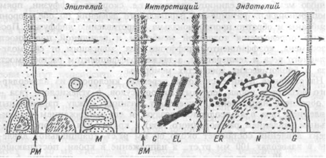 Количество кислорода, поступающего в альвеолярное пространство из вдыхаемого воздуха в единицу времени в стационарных условиях дыхания, равно количеству кислорода, переходящего за это время из альвеол в кровь легочных капилляров. Именно это обеспечивает постоянство концентрации (и парциального давления) кислорода в альвеолярном пространстве. Эта основная закономерность легочного газообмена характерна и для углекислого газа: количество этого газа, поступающего в альвеолы из смешанной венозной крови, протекающей по легочным капиллярам, равно количеству углекислого газа, удаляющегося из альвеолярного пространства наружу с выдыхаемым воздухом. У человека в покое разность между содержанием кислорода в артериальной и смешанной венозной крови равна 45-55 мл О2 на 1 л крови, а разность между содержанием углекислого газа в венозной и артериальной крови составляет 40- 50 мл СО2 на 1 л крови. Это значит, что в каждый литр крови, протекающей по легочным капиллярам, поступает из альвеолярного воздуха примерно 50 мл О2, а из крови в альвеолы — 45 л СО2. Концентрация О2 и СО2 в альвеолярном воздухе остается при этом практически постоянной, благодаря вентиляции альвеол. Обмен газов между альвеолярным воздухом и кровью Альвеолярный воздух и кровь легочных капилляров разделяет так называемая альвеолярно-капиллярная мембрана, толщина которой варьирует от 0.3 до 2.0 мкм. Основу альвеолярно-капиллярной мембраны составляет альвеолярный эпителий и капиллярный эндотелий, каждый из которых расположен на собственной базальной мембране и образует непрерывную выстилку, соответственно, альвеолярной и внутрисосудистой поверхности. Между эпителиальной и эндотелиальной базальными мембранами находится интерстиций. В отдельных участках базальные мембраны практически прилегают друг к другу (рис.8.6).