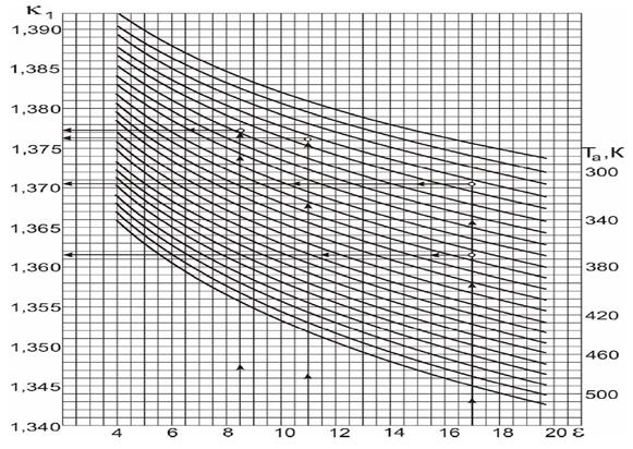 Рисунок 1.1 – Номограма для визначення показника адіабати стиску к1 Величина показника політропи стиску n 1 визначається на основі дослідних даних залежно від ступеня стиску і температури в кінці процесу стиску Та. Для автотракторних двигунів n 1 =(к 1 – 0,01 )…(к 1 – 0,04 ), де к 1 – показник адіабати стиску, який залежить від ε і Та. Визначається з номограми (рисунок 1.1). Приймаємо n 1=1,36. Температуру в кінці процесу стиску визначаємо за формулою: Т с =Та· За формулами, які наведено в таблиці 1.1, середня мольна теплоємність в кінці процесу стиску при сталому об’ємі для повітря і компонентів залишкових газів становить: Таблиця 1.1 – Середні мольні теплоємності для газів