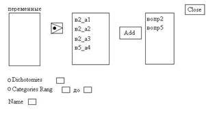 Если необходимо объединить несколько альтернатив, активизируем команду «категории». Categories – диапазон значений, который принимает данная переменная; число значений для данного вопроса. Если в вопросе 15 вариантов ответа, то диапазон от 1 до 15 значения. Name 2 Если необходимо объединить в одну переменную все выбранные значения переменной. Для того чтобы корректно выйти из программы, нужно нажать Close. Чтобы получить таблицу ОЧР для определённых переменных, необходимо повторно войти в Analyze ---> Multiple Response, в правом меню активизируются команды: Freguensies Crosstabs