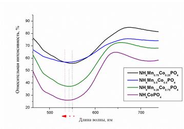 Рис. Спектры VIS для твердых растворов NH4Fe1-xMnxPO4.