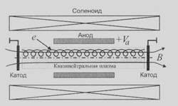 На практике, например в неоновых трубках, чаще используют катод в виде полого цилиндра с диаметром, примерно равным толщине катодного слоя. В более сложных устройствах полый катод могут помещать в продольное магнитное поле или снабжать термоэмиссионным источником электро- нов. Во многих случаях через катодный цилиндр прокачивают рабочий газ. Плазменный источник на основе полого катода изображен на рис. 10.10. Плотная плазма, образующаяся в полом катоде, эмитирует электроны вдоль силовых линий слабого расходящегося магнитного поля и поддерживает разряд в цилиндрической камере. Другие конструкции полых катодов и устройства на основе разрядов с полым катодом описаны, в частности, в монографиях [5,49].