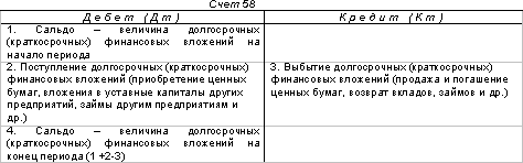 Финансовые вложения учитываются на активном счете 58 «Финансовые вложения». К счету 58 открываются субсчета: 58-1 «Паи и акции», 58-2 «Долговые ценные бумаги», 58-3 «Предоставленные займы», 58-4 «Вклады по договору простого товарищества».