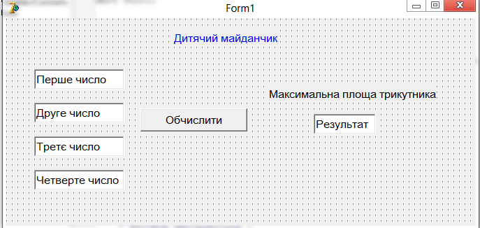 3. Спочатку введемо в програму числа-довжини сторін, які назвали діти. Оголошуємо змінні в заголовку програми(там вже є слова Var). Var stor1, stor2, stor3, stor4: integer; Щоб перенести числа введені у віконечка на формі у змінні, оголошені раніше потрібно двічі клацнути мишкою по кнопці "Обчислити" і записати такі рядки: stor1:=strtoint(edit1.text); stor2:=strtoint(edit2.text); stor3:=strtoint(edit3.text); stor4:=strtoint(edit4.text); Тепер можна сміливо використовувати наші змінні у програмі.