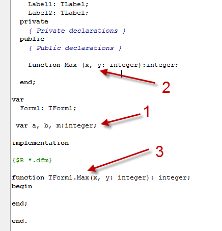 Як завжди у заголовку програми оголошуємо змінні var a, b, m: integer; Трохи вище у програмі в розділі Public записуємо рядок function Max (x, y: integer): integer; Далі натискаємо вже відому нам комбінацію клавіш Ctrl+Shift+C і спостерігаємо як створюється порожня функція. Залишилося тільки написати саму функцію. Ваша програма повинна виглядати так: