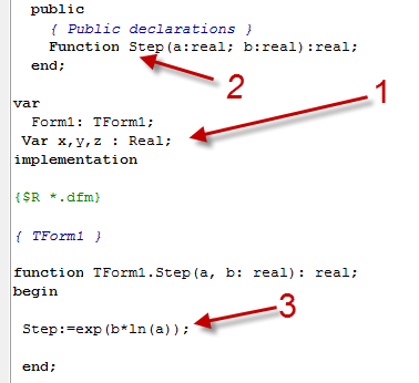 2. Переходимо у вікно з текстом програми. В заголовку, там, де опис глобальних змінних, записуємо: Var x,y,z: Real; Далі потрібно описати функцію, яка піднімає число до степеня. У розділі Public записуємо. Function Step(a:real; b:real):real; натискаємо Ctrl+Shift+c і вписуємо текст функції у шаблон один рядочок. Function Step(a:real; b:real):real; Begin Step:=exp(b*ln(a)); End;