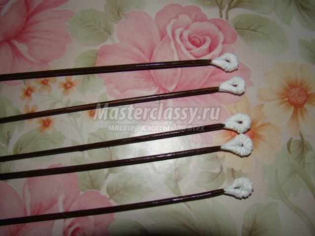 Затем промазывая склеенный край капельки клеем приклеить на шпажку 16 белых и 5 зеленых капелек чередуя как понравится.