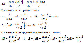 Для тока, текущего по прямому проводнику (рис. 1, 2), магнитная индукция рассчитывается следующим образом: Магнитное поле для кругового тока (рис. 3) вычисляется по формуле:.