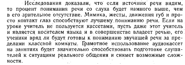 1. Трудности, обусловленные условиями аудирования. К ним относятся внешние шумы, помехи, плохая акустика, что характерно, например, для вокзалов. Качество звукозаписи, что связано с качеством используемой на занятиях техники. Также немаловажно наличие или отсутствие источника речи.