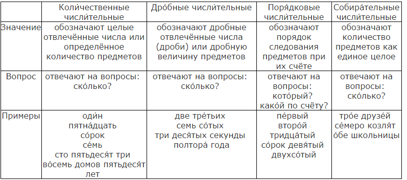Имя числительное - это самостоятельная часть речи, которая обозначает количество и порядок предметов при счёте и отвечает на вопросы сколько? который? Начальная форма имени числительного - форма именительного падежа. По выражаемому значению и грамматическим особенностям числительные делятся на две группы: 1) количественные (два, двенадцать, двадцать два), 2) порядковые (второй, двенадцатый, двадцать второй). Количественные числительные делятся на три грамматических разряда: 1) числительные, обозначающие целые числа, 2) числительные, обозначающие дробные числа, 3) собирательные. По особенностям словообразования в составе числительных выделяются: 1) простые (пять, пятый, пятнадцать, двадцать), 2) сложные (пятьдесят, пятидесятый), 3) составные (сто пятнадцать, двести пятьдесят второй, две пятых). Имена числительные изменяются по падежам, а порядковые также по числам и родам. В предложении имена числительные чаще выступают в роли подлежащего, сказуемого, определения, реже - в роли именной части составного сказуемого и обстоятельства. Например: Мы - два грозой зажжённые ствола, Два пламени полуночного бора! Мы - два в ночи летящих метеора, Одной судьбы двужалая стрела! Мы - два коня, чьи держит удила Разряды числительных