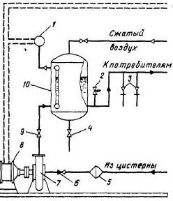 Рис 3 1. моноэлектрическое реле 2. предохранительный клапан 3. водоразборные краны 4. спускной клапан 5. фильтр 6. невозвратно-запорный клапан 7. насос 8. электродвигатель 9. запорный клапан 10. пневмоцистерна Широкое распространение на судах в последние годы получили станции приготовления питьевой воды с использованием озонирования. Обеззараживание воды озонированием в гигиеническом отношении является наиболее совершенным. При озонировании устраняются привкусы и запахи, выделяемые некоторыми водорослями и микроорганизмами. Озон действует в 15-20 раз быстрее хлора, а потребность в нем в 2,5 раза меньше при достижении равного эффекта. После обработки хлором вода имеет зеленовато-желтый цвет, озонирование придает ей голубой оттенок. Обеззараживание воды озоном способствует удалению из нее железа и марганца. Озонирование является универсальным методом обработки воды, так как проявляет свое действие одновременно в бактериалогическом, физическом отношениях. Минеральные вещества с химической точки зрения после озонирования не изменяются. Вместе с тем при обработке воды озоном в нее не вносятся никакие дополнительные посторонние вещества, как, например, при хлорировании. 4. Снабжение судов пресной водой из береговых источников Вода из береговых источников, предназначенная для хозяйственно-питьевых целей, может приниматься на суда как непосредственно из портовых водопроводных сооружений, так и с судов-водолеев либо с других судов, предназначенных для транспортировки воды и специально для этой цели оборудованных. При осуществлении надзора за водоснабжением организации и учреждения санитарно-эпидемической службы должны руководствоваться только документами общесоюзного и республиканского значения, а также указаниями и инструкциями министерств здравоохранения. Вода, принимаемая на суда в отечественных портах, должна соответствовать требованиям ГОСТ 2874-73 "Вода питьевая" и дополняющих либо заменяющих его общегосударственных документов при издании таковых. При приеме воды в иностранных портах необходимо получение от местных санитарных органов либо портовых властей сертификатов, удостоверяющих соответствие качества воды требованиям международных или национальных стандартов. При приеме воды с водоналивного или другого судна в соответствующем товарном документе должны быть указаны место и дата получения воды передающим судном, наличие сертификата (если вода принята в иностранном порту) и сделана отметка о проведении обеззараживания воды перед ее передачей на принимающее судно. Документ должен быть заверен на передающем судне ответственным лицом. Полученные сертификаты и передаточные документы должны храниться в судовом архиве и контролироваться организациями и учреждениями санитарно-эпидемиологической службы по прибытии судна в отечественный порт. Портовые водопроводные сооружения, водоразводящие сети и водораздаточные устройства по своей конструкции, расположению и условиям эксплуатации должны соответствовать требованиям действующих строительных норм и правил, "Санитарных правил для морских судов СССР", "Санитарных правил для морских судов промыслового флота СССР". Передача воды на судно в порту должна осуществляться только из специальных гидрантов и только портовыми, а не судовыми шлангами. Шланги до