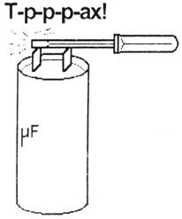 Это сопротивление, соединяющее выводы конденсатора, имеет достаточно большую величину (R = 15 кОм), чтобы не изменить работу конденсатора, но вместе с тем обеспечить его разрядку, когда питание отключено. Однако даже если конденсатор снабжен разрядным сопротивлением, перед каждой операцией с ним замкните накоротко его выводы с помощью отвертки. При снятии напряжения конденсатор не разряжается мгновенно и может потребовать для разрядки несколько минут. Перед тем, как приступить к изучению обычных неисправностей в конденсаторах, напомним, что при подключении омметра к выводам исправного конденсатора (предварительно разрядив конденсатор) стрелка быстро указывает на ноль, затем медленно возвращается к бесконечности. Если поменять местами зажимы омметра (изменить полярность), картина повторится.