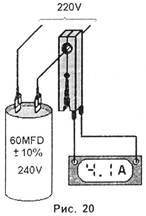 Схему необходимо защитить либо автоматом защиты, либо плавким предохранителем с рубильником. Измерение (рис. 19) должно быть как можно более коротким по времени, т.к., пусковой конденсатор опасно долго держать под напряжением -более 5 секунд. При напряжении 220В действительная емкость конденсатора (в мкФ) примерно в 14 раз больше потребляемого тока (в амперах).
