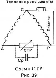 Следовательно, схема PSC используется, как правило, в небольших электродвигателях с незначительным моментом сопротивления на валу (малые холодильные компрессоры для бытовых холодильников, электродвигатели вентиляторов небольших кондиционеров). При подаче напряжения на схему постоянно подключенный конденсатор (Ср) дает толчок, позволяя запустить двигатель. Когда двигатель запущен, пусковая обмотка остается под напряжением вместе с последовательно включенным конденсатором, что снижает силу тока и позволяет повысить крутящий момент при работе электродвигателя. Схема СТР изученная ранее, называется также РТС (Positive Temperature Coefficient) и используется в качестве относительно простого пускового устройства. Она может быть усовершенствована добавлением постоянно подключенного конденсатора, как показано пунктиром на схеме рис. 39.