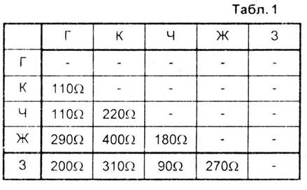 Переключатель имеет 4 клеммы: вход (В), малая скорость (МС), средняя скорость (СС), большая скорость (БС), позволяющие собрать электродвигатель с сетью таким образом, чтобы выбрать требуемое значение числа оборотов (МС, СС или БС). Из двигателя выходят 5 проводов различного цвета: Голубой (Г), Красный (К), Черный (Ч), Желтый (Ж) и Зеленый (3). В таблице 1 приведены величины, полученные в результате измерения сопротивлении между каждой из двух пар проводов (например, между проводами Ж и 3 сопротивление составляет 270 0м). Выполните эскиз внутренней схемы электродвигателя. Решение: