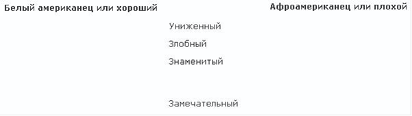 И так далее… Тут со мной произошло нечто странное: задача расстановки слов и портретов в соответствующие категории внезапно усложнилась. Иногда я относил определение или изображение к одной категории, на самом деле имея в виду другую. Я старался изо всех сил, но все время сбивался. Например, если слово «хороший» стояло в паре с «афроамериканцем», то почему-то у меня возникала заминка, когда я хотел поместить слова вроде «знаменитый» или «замечательный» в категорию «хороший». А если слово «плохой» шло в паре с «белым американцем», то я невольно останавливался, прежде, чем поставить в эту категорию слово «злобный». Но это еще не все. Потом была вторая часть теста. На этот раз категории были перевернуты.