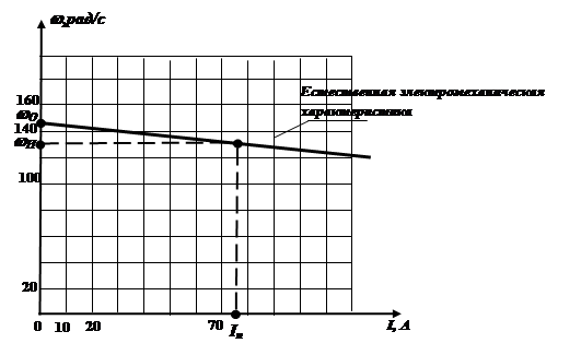 Решение: Для построения характеристик, представляющих собой прямые линии, достаточно рассчитать координаты двух точек: номинального режима и холостого хода. 1.Определим номинальные скорость и момент двигателя: ωном=2πnном/60=2· 3,14 · 1250/60=131 рад/с; Мном=Рном/ ωном = 300000/131=2306 Н· м. 2.Определим скорость холостого хода: ωо= Uном/ (kФном) =440/3,08=144 рад/с, где kФном=Мном/Iном = 2306/750=3,08 В·с. 3.Построение естественной электромеханической и механической характеристик двигателя.
