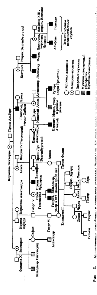 В гомозиготном состоянии у женщин ген гемофилии летален. Особей женского пола, гетерозиготных по любому из сцепленных с полом признаков, называют носителями соответствующего рецессивного гена. Они фенотипически нормальны, но половина их гамет несет рецессивный ген. Несмотря на наличие у отца нормального гена, сыновья матерей-носителей с вероятностью 50% будут страдать гемофилией. Один из наиболее хорошо документированных примеров наследования гемофилии мы находим в родословной потомков английской королевы Виктории. Предполагают, что ген гемофилии возник в результате мутации у самой королевы Виктории или у одного из ее родителей. Среди унаследовавших это врожденное заболевание - цесаревич Алексей, сын последнего русского царя Николая II. Мать цесаревича, царица Александра Федоровна (Алиса, рис.2), получила от своей бабушки королевы Виктории ген гемофилии и передала его в четвертом поколении бывшему наследнику царского престола. На рис.2 показано, как этот ген передавался ее потомкам.