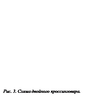 где rf - картирующая функция (в нашем случае - это частота учитываемых кроссинговеров), d - реальное расстояние, на котором происходят обмены, e - основание натурального логарифма. При изучении множественных обменов и интерференции между ними используют тетрадный анализ. Для этого рассматривают тригибридное скрещивание (ABC x abc) по сцепленным генам. Учитывая, что кроссинговер происходит на стадии 4-х хроматид, возможны три типа двойных обменов. Это двойные двухроматидные обмены, двойные треххроматидные обмены и двойные четыреххроматидные обмены только между несестринскими хроматидами, последствия которых генетически различимы (рис. 4).