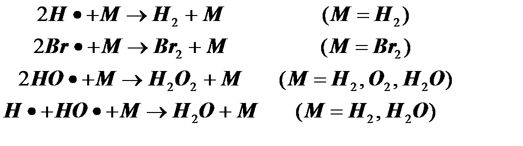 где R1, R2- обладающие свободной валентностью атомы или молекулярные свободные радикалы, а M - любая третья частица. С формально-кинетической точки зрения всякий такой процесс выглядит как процесс второго порядка, и третья частица не учитывается в материальном балансе и не определяет стехиометрию процесса. Её функция состоит только лишь в отводе избытка энергии от образующейся частицы