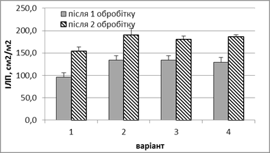 Рис. 1. Площа листової поверхні рослин гороху за умов позакореневого обробітку розчинами токоферолу та його комплексу з ДМСО (n=4)