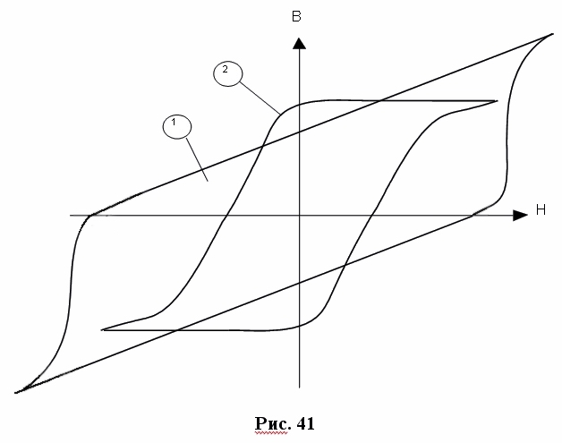 Магнитная вязкость проявляется в запаздывании мгновенных значений индукции от ее значений, соответ-ствующих статической петле гистерезиса. Все магнитные материалы можно разделить на магни-тотвердые и магнитомягкие. Магнитотвердые материалы используют для изготов-ления постоянных магнитов. Они обладают большой пло-щадью гистерезисной петли (кривая 1 рис. 40).