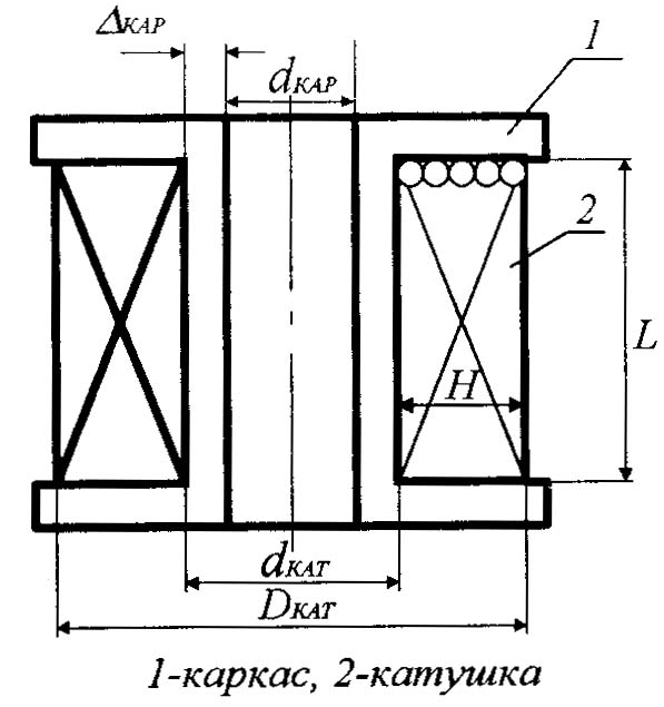 Рис. 48 ЗдесьDKAT – внешний диаметр катушки, dKAT – внутренний диаметр катушки, dKAP – внутренний диаметр каркаса, ∆KAP – толщина стенки каркаса, H – ширина катушки, L – высота катушки. Сечение провода q находим, исходя из данной н.с. IW=WU/R, где R – сопротивление всей обмотки. Если принять сопротивление одного витка обмоткидлиной ℓ СР сечением q R1 = ρ ℓ СР/ q, то сопротивление W витков соответственно будет в Wраз больше: R = R1W= ρ ℓ СРW/ q, тогда намагничивающая сила IW = UqW/ (ρ ℓ СРW) = Uq/(ρ ℓ СР), (48) откуда q = ρ ℓ СРIW/U, (49) где ρ – удельное электрическое сопротивление материала провода, для медиρ = 0,0175 Ом.мм2/м; ℓ СР – средняя длина витка, для катушки круглого сечения ℓ СР = π(DKAT+dKAT)/2, для катушек другого сечения необходимо определить диаметр среднего витка. Из уравнения (48) следует, что если при неизменной средней длине витка ℓ СР и заданном напряжении Uтребуется увеличить н.с., то необходимо взять провод большего сечения. Из формулы (49) можно определить диаметр провода: