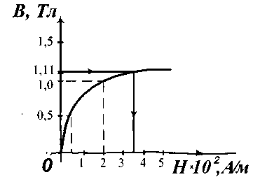 3. Для определения напряженности магнитного поля в магнитопроводе Нм необходимо использовать кривую намагничивания (рис.54) для материала Э4. Из кривой В(H) следует, что Hм=3,6•102А/м. Напряженность магнитного поля в воздушном зазоре Hδ определяем из соотношения: Рис.54 B= μ.μ0.H, где μ воздуха =1, μ0= 4 .10-7 Гн/м, следовательно, Hδ =B/μ0=0,8.10 6.1,11=0,888.106 A/м.