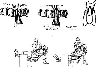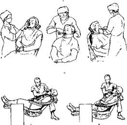 Рис. 47. Положение больного во время удаления зубов: I - положение сидя в кресле: а — на верхней челюсти, б — на нижней челюсти справа, в - на нижней челюсти слева, II - положение лежа в кресле: г - на верхней челюсти, д - на нижней челюсти