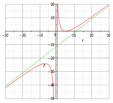 Уравнение наклонной асимптоты найдено Проверим, имеет ли данная функция вертикальную асимптоту. Прямая, имеющая уравнение Так как прямая