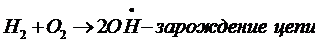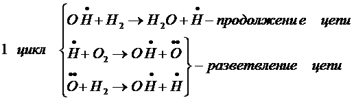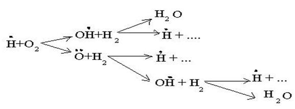 когда за один цикл превращений каждый вступающий в реакцию атом водо-рода вызывает образование двух молекул воды и трех новых атомов водоро-да. Обрыв цепей проходит либо на стенке: