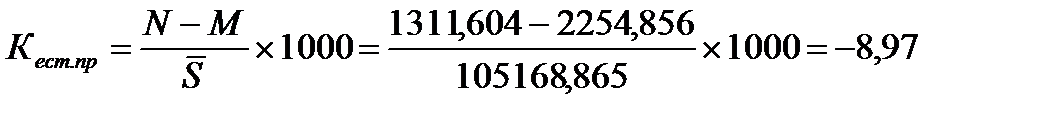 - коэффициент общего прироста: Кобщ = Кест.пр + Кмех.пр = -8,97 + 0,78 = -8,19 %о. 4. Коэффициент жизненности Покровского: 5. Специальный коэффициент фертильности женщин: