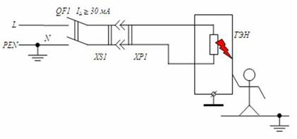 В случае защиты УЗО электроприемников с металлическим корпусом обеспечивается быстродействующая защита от короткого замыкания (КЗ) на корпус. Рассмотрим пример – защиту при помощи УЗО электронагревателя – Рисунок 4.