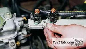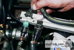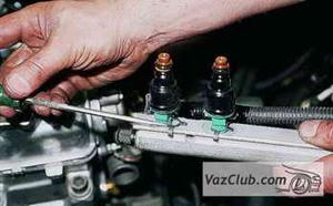 Снимаем топливную рампу с форсунками (см. Снятие топливной рампы двигателя ВАЗ 2111 и Снятие топливной рампы и регулятора давления топлива двигателя ВАЗ 2112).