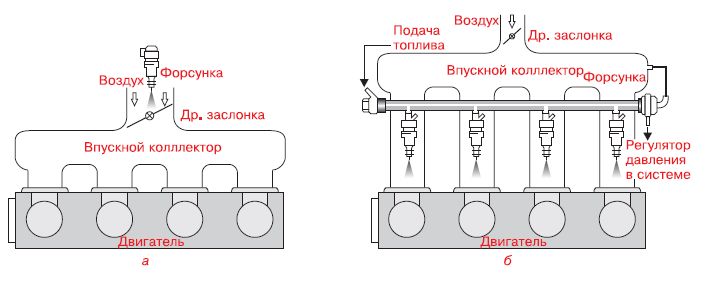 С середины 1980-х годов карбюраторы стали вытесняться более эффективными инжекторными системами. Главными их преимуществами являются лучшие пусковые свойства (они меньше зависят от окружающей температуры), надежность, экономичность, лучшие мощностные характеристики, а также меньшая токсичность выхлопа. Однако инжекторные системы более привередливы к качеству бензина. Так, не допускается работа двигателей с системой впрыска топлива на этилированном бензине. Это приводит к выходу из строя нейтрализатора и датчика концентрации кислорода. Слово injector в переводе с английского означает «форсунка» (рис. 2.16). Первые системы питания, использовавшие принцип впрыска, появились в конце XIX века, однако из-за сложной конструкции и отсутствия должных систем управления не нашли широкого применения. Вновь о системах впрыска вспомнили в 1960-х годах. Тогда они были исключительно механическими, затем им на смену пришли современные системы впрыска с электронным управлением. Эти системы в зависимости от количества форсунок и места впрыска топлива делятся на одноточечные (моновпрысковые) (рис. 2.17, а) и многоточечные (в них каждый цилиндр имеет персональную форсунку, впрыскивающую топливо во впускной коллектор в непосредственной близости от впускного клапана конкретного цилиндра) (рис. 2.17, б).