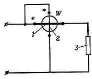 Схема включения ваттметра W: 1 — последовательная цепь (неподвижная катушка); 2 — параллельная цепь(подвижная катушка); 3 — нагрузка. В электродинамич. ваттметре поворот подвижной катушки в магн. поленеподвижной катушки пропорц. измеряемой мощности. Для уменьшения искажающего влияния последовательная цепь В. должна обладать малым, а параллельная— большим сопротивлением. При измерениях на перем. токе важно также, чтобы сопротивлениепараллельной цепи было чисто активным. Осн. частью В. явл. электроизмерит. механизм обычно электродинамич. или ферродинамич. системы, реже —индукционной или электростатической (см. соответств. статьи). Для расширения пределов измерений В.используют: на пост. токе — шунты и добавочные сопротивления, на перем. токе — измерит.трансформаторы тока и напряжения. Для измерения мощности на частотах выше 5 кГц, а также малоймощности (менее 100 мВт) применяют термоэлектрич. и терморезистивные В., В. на ПП элементах, В. спреобразователями Холла, пондеромоторные В., калориметрич. В. Ваттметры с электроизмерит. механизмомхарактеризуются след. данными: пределы по току — от 10 мА до 10 А, по напряжению — от 15 до 600 В, осн.погрешность в % от верх. предела измерений — до 0,2%. Применение измерит. трансформаторов тока инапряжения позволяет измерять мощность до 12 ГВт в электрич. цепях с током до 15 кА и напряжением до500 кВ. Техн. требования к В. стандартизованы в ГОСТах 22261—76, 8476—60 и 1.3605—75.