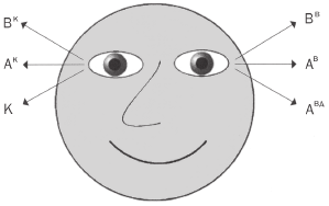 В = визуальный (образное представление) А = аудио (звуковое восприятие) К = кинестетический (чувственное представление; прикосновение, ощущение, также запах и вкус) в = воспоминание (вновь вызванное в памяти) к = конструкция (выдуманное) вд = внутренний диалог (именно так!) Глаза человека перемещаются вверх, если он думает об изображении (В), в сторону, если ему в голову приходят звуки, шумы или слова (А), и влево вниз, если дело касается осязательного ощущения. Если человек смотрит прямо на собеседника, скорее всего, он придумывает некий образ. На заметку: для некоторых людей, включая 50 % левшей, эта схема верна в зеркальном отображении. Даже закоренелые приверженцы НЛП не станут утверждать, что эта схема применима ко всем без исключения. Точность данного аналитического метода, однако, удивительно высока. Если же кому-либо присущи другие реакции, для этого конкретного человека они будут постоянными. Например, кто-то представляет себе определенный образ и смотрит при этом вниз, а не вверх. Тогда такой человек будет смотреть вниз каждый раз, когда перед его внутренним взором возникает картинка, из этого и нужно исходить в дальнейшем. НЛП позволяет узнать даже больше: наблюдая за тем, в какую сторону смотрит человек, можно определить, вспоминает он что-то, что уже было, или конструирует нечто новое! К примеру, следующие вопросы, как правило, побуждают вашего собеседника перевести взгляд вверх направо, поскольку речь идет о визуальном воспоминании: Верхний сигнал светофора красный или зеленый? Сколько деревьев растет перед вашим домом? Какого цвета глаза у вашей мамы? Сколько дверей в вашей квартире? А раздумывая над следующими вопросами, ваш собеседник, скорее всего, переведет взгляд с вас горизонтально вправо потому, что здесь мы имеем дело с воспоминаниями о звуках, шумах или словах: Вспомните вашу любимую песню! Какая буква в алфавите стоит перед буквой Р? Вспомните звучание голоса вашего лучшего друга. Следующие вопросы побуждают к звуковому конструированию, поэтому взгляд вашего собеседника сместится влево: Как будет звучать ваше имя, если его произнести задом наперед? Как будет звучать девятая симфония Бетховена, если ее исполнить на флейте? Чтобы ответить на следующие вопросы, вашему собеседнику придется заняться визуальным конструированием, поэтому его взгляд переместится вниз и влево: Как будет выглядеть ваш лучший друг, если выкрасит волосы в розовый цвет? Как будет выглядеть ваша комната без мебели? Во время разговора с самим собой человек опустит глаза вниз вправо, так как ведет своего рода внутренний диалог. Такую реакцию можно вызвать, например, если попросить человека проанализировать про себя свои планы на будущее. Когда дело касается запахов, эмоциональных переживаний и тактильных ощущений, глаза человека опускаются вниз влево. Такую реакцию можно встретить, если попросить собеседника сконцентрироваться на температуре ступней его ног. Другие примеры: Вам знакомо ощущение, когда вы заходите в теплое море и вода ласково обволакивает ваше тело? Что вы чувствуете зимой, выходя на мороз из теплого уютного дома? Тренироваться в наблюдении за движениями глаз хорошо с помощью телевизионных интервью. После вы можете приступать к дальнейшим упражнениям, лучше всего с реальным партнером, который, правда, не должен знать вас сл