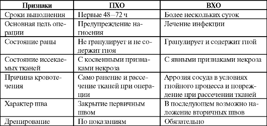 Задачи лечения в фазе воспаления В первой фазе раневого процесса (фаза воспаления) перед хирургом стоят следующие основные задачи: • борьба с микроорганизмами в ране; • обеспечение адекватного дренирования экссудата; • содействие скорейшему очищению раны от некротических тканей; • снижение проявлений воспалительной реакции. При местном лечении гнойной раны используют методы механической, физической, химической, биологической и смешанной антисептики. При нагноении послеоперационной раны обычно бывает достаточно снять швы и широко развести её края. При выраженном воспалении и обширном некрозе в гнойной ране необходимо выполнение вторичной хирургической обработки (ВХО) раны. Вторичная хирургическая обработка раны Показанием к ВХО раны является наличие гнойной раны при отсутствии адекватного оттока из неё (задержка гноя) или образовании обширных зон некроза и гнойных затёков. Противопоказанием служит только крайне тяжёлое состояние больного, при этом ограничиваются вскрытием и дренированием гнойного очага. Задачи, стоящие перед хирургом, выполняющим ВХО раны: • вскрытие гнойного очага и затёков; • иссечение нежизнеспособных тканей; • осуществление адекватного дренирования раны. Перед началом ВХО следует определить видимые границы воспаления, локализацию гнойного расплавления, наиболее короткий доступ к нему с учётом расположения раны, а также возможные пути распростра- нения инфекции (по ходу сосудисто-нервных пучков, мышечно-фасциальных влагалищ). Кроме пальпаторного исследования, применяют различные виды инструментальной диагностики: ультразвуковой, термографический, рентгеновский (при остеомиелите) методы, КТ. Как и первичная хирургическая обработка, ВХО является самостоятельным оперативным вмешательством. Её выполняют в операционной бригадой хирургов с использованием обезболивания. Только адекватная анестезия позволяет решить все задачи ВХО. После вскрытия гнойного очага проводят тщательную инструментальную и пальцевую ревизию по ходу самой раны и возможного нахождения затёков, которые в последующем также вскрывают через основную рану или контрапертуру и дренируют. Выполнив ревизию и определив объём некроза, производят эвакуацию гноя и иссечение нежизнеспособных тканей (некрэктомия). При этом нельзя забывать, что вблизи или в самой ране могут находиться крупные сосуды и нервы, которые необходимо сохранить. Перед окончанием операции полость раны обильно промывают антисептическими растворами (пероксид водорода, борная кислота и др.), рыхло тампонируют марлевыми тампонами с антисептиками и дренируют. Наиболее выгодным способом лечения при обширных гнойных ранах является проточно-промывное дренирование. В случае локализации повреждения на конечности необходима иммобилизация. Чаще используют гипсовую лонгету. В табл. 4-2 представлены основные отличия ПХО и ВХО раны. Лечение гнойной раны после операции После выполнения ВХО или простого раскрытия (вскрытия) раны на каждой перевязке врач осматривает рану и оценивает её состояние, от- Таблица 4-2. Отличия первичной и вторичной хирургической обработки раны