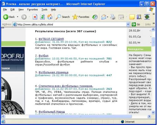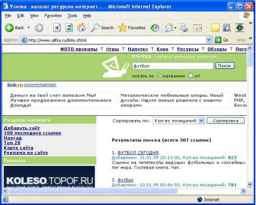 и получает список ссылок с описаниями сайтов, которые наиболее полно соответствуют его запросу. Стоит отметить, что этот поиск происходит не в содержимом WWW-серверов, а в их кратком описании, хранящихся в каталоге. В нашем примере в каталоге также имеется возможность сортировки сайтов по количеству посещений, по алфавиту, по дате занесения.