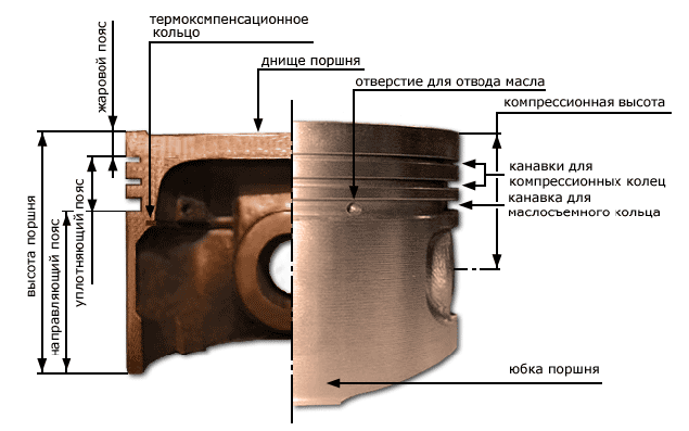 Если углубления на днище увеличивают объем камеры сгорания, то для уменьшения объема применяют вытеснители. Вытеснителем называют объем металла, который находится выше плоскости днища. «Жаровым поясом»(огневым), называют расстояние от днища до канавки первого поршневого кольца. Чем ближе располагаются поршневые кольца к днищу, тем более высокой тепловой нагрузке они подвергаются, тем больше сокращается их ресурс. Уплотняющий участок - это участок канавок, расположенных на боковой цилиндрической поверхности поршня. Канавки предназначены для установки поршневых колец. Поршневые кольца обеспечивают подвижное уплотнение. На всех моделях для двигателей ВАЗ, выполнены две канавки под компрессионные кольца и одна канавка под маслосъемное кольцо. В канавке под маслосъемное кольцо есть отверстия, через которые отводится излишек масла во внутреннюю полость поршня. Уплотняющий участок выполняет еще одну очень важную функцию - через установленные поршневые кольца, осуществляется отвод значительной части тепла от поршня к цилиндру. Если конструкция изделия не будет предусматривать эффективный отвод тепла от днища, то это приведет к его прогоранию. По расчетам, через компрессионные кольца, передается до 60-70% выделенного тепла. Однако это требует плотного прилегания поршневых колец к цилиндру и к поверхностям канавок. Для обеспечения работоспособности, торцевой зазор первого компрессионного кольца в канавке должен составлять 0,045-0,070мм. Для второго компрессионного кольца зазор - 0,035-0,060мм, для маслосъемного – 0,025-,0050мм. Между внутренней поверхностью кольца и канавки должен быть радиальный зазор - 0,2-0,3мм. Головку поршня образуют днище и уплотняющая часть. Расстояние от оси поршневого пальца до днища, называют компрессионной высотой поршня. «Юбкой», называют нижнюю часть поршня. На этом участке находятся бобышки с отверстиями – место, куда устанавливается поршневой палец. Внешняя поверхность юбки, исполняет роль опорной и направляющей поверхности. Юбка обеспечивает соосность положения детали к оси цилиндра блока. Кроме того, боковая поверхность юбки участвует в передаче к цилиндру возникающих поперечных усилий. На поверхность юбки(или на все изделие) могут наноситься защитные покрытия улучающие прирабатываемость и снижающих трение. Покрытие слоем олова позволяет сгладить неточности профиля и предотвратить наволакивание алюминия на поверхности цилиндра. Могут применяться покрытия созданные на основе графита и дисульфида молибдена. Другой способ, снижающий потери на трение – нанесение на юбке канавок специального профиля. Глубина канавок составляет 0,01-0,015мм. При движении, канавки не только удерживают масло, но и создают гидродинамическую силу, которая препятствует контакту со стенками цилиндра. Одним из факторов определяющих геометрию поршня, является необходимость снижения сил трения. Для этого требуется обеспечение определенной толщины масляного слоя в зазоре между поршнем и стенками цилиндра. Причем маленький зазор повлечет за собой увеличение сил трения и как следствие повышение нагрева деталей и их ускоренный износ а возможно и заклинивание. Слишком большой зазор, увеличит шумность двигателя, приведет к росту динамических нагрузок на сопрягаемые детали и будет способствовать их ускоренному износу. Поэтом