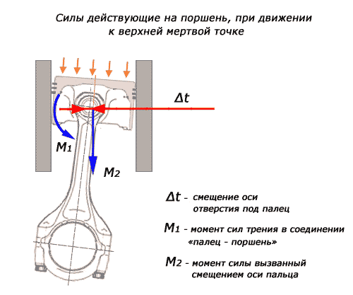 Для компенсации тепловых деформаций, в поперечном сечении поршень выполнен виде овала. Это связано с тем, что в районе бобышек под поршневой палец сосредоточен значительный объем металла. При нагреве, в плоскости поршневого пальца, расширение будет осуществляться в большей степени. Овальность и бочкообразность детали в холодном состоянии, позволяет иметь поршень, приближающийся к цилиндрической форме, при работающем двигателе. Такая форма изделия создает сложности при контроле его диаметра. Фактический диаметр можно определить, только замеряя его в плоскости перпендикулярной оси отверстия под поршневой палец на определенном расстоянии от днища. При этом, для разных моделей это расстояние будет отличаться. Тепловые нагрузки порождают еще одну проблему. Поршни изготавливают из алюминиевого кремнесодержащего сплава, а для блока цилиндров используют чугун. У этих материалов разная теплопроводность и разный коэффициент теплового расширения. Это приводит к тому, что в начале работы двигателя, поршень нагревается и увеличивается в диаметре быстрее, чем увеличивается внутренний диаметр цилиндра. При и без того малых зазорах, это может приводить к повышенному износу цилиндров, а в худшем случае, к заклиниванию поршня. Для решения этой проблемы, во время отливки поршня, в тело заготовки внедряют специальные стальные или чугунные элементы, которые сдерживают резкое изменение диаметра. Для уменьшения теплового расширения и отвода тепла, на некоторых типах двигателя, используются системы подачи масла во внутреннюю полость поршня. Поршневой палец обеспечивает шарнирное соединение поршня и верхней головки шатуна. Во время работы двигателя, на поршневой палец воздействуют значительные переменные силы. Палец и отверстия под палец должны сопрягаться с минимальным зазором, обеспечивающим смазку. На двигателях ВАЗ используется два типа шарнирного соединения «поршень-палец-шатун». На поршнях моделей 2101, 21011, 2105, 2108, 21083 – палец устанавливается в верхней головке шатуна по плотной посадке, исключающей его вращение. Отверстие в поршне под поршневой палец выполнено с зазором, обеспечивая свободное вращение. В дальнейшем от этой схемы отказались и перешли на схему с «плавающим» пальцем. На поршнях моделей 21213, 2110, 2112, 21124, 21126, 11194, 21128 – палец устанавливается с минимальным зазором и в головке шатуна, и в отверстиях поршня. Для исключения осевого смещения пальца, в поршне, в отверстиях под поршневой палец устанавливаются стопорные кольца. Во время работы, у пальца есть возможность проворачиваться, обеспечивая равномерный износ поверхностей. Для обеспечения надежной смазки пальцев, в бобышках предусмотрены специальные отверстия. По результатам фактического замера отверстия под поршневой палец, поршням присваивается одна из трех категорий(1-я, 2-я, 3-я). Разница в размерах для категорий составляет - 0,004мм. Номер категории клеймится на днище. Для обеспечения необходимого зазора, поршневые пальцы, по наружному диаметру подразделяются на три класса. Отличие в размерах составляет - 0,004 мм. Маркировка класса производится краской по торцу пальца: синий цвет - первый класс, зеленый - второй, красный - третий класс. При сборке, поршню первой категории должен подбираться палец первого класса и т.д. Особенностью работы шатунного механизма, является 