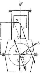 Суммарную силу P1 разложить на можно две силы: силу S, направленную вдоль оси шатуна, и силу N, прижимающую поршень к стенкам цилиндра.