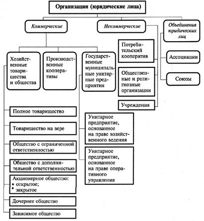 На основании Гражданского Кодекса Российской Федерации (ГК РФ), предусматривается создание широкого набора коммерческих организаций, большая часть которых — хозяйственные. Основные организационно-правовые формы субъектов хозяйствования, являющихся юридическими лицами, представлены на рисунке: